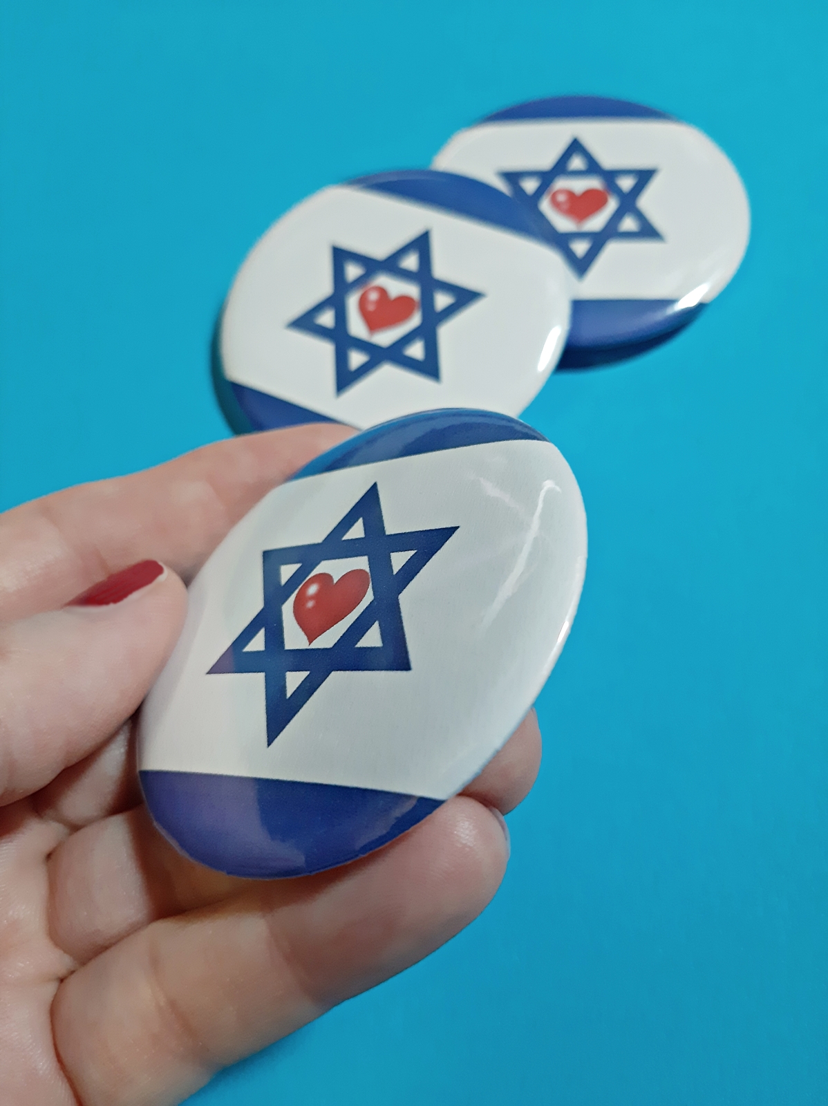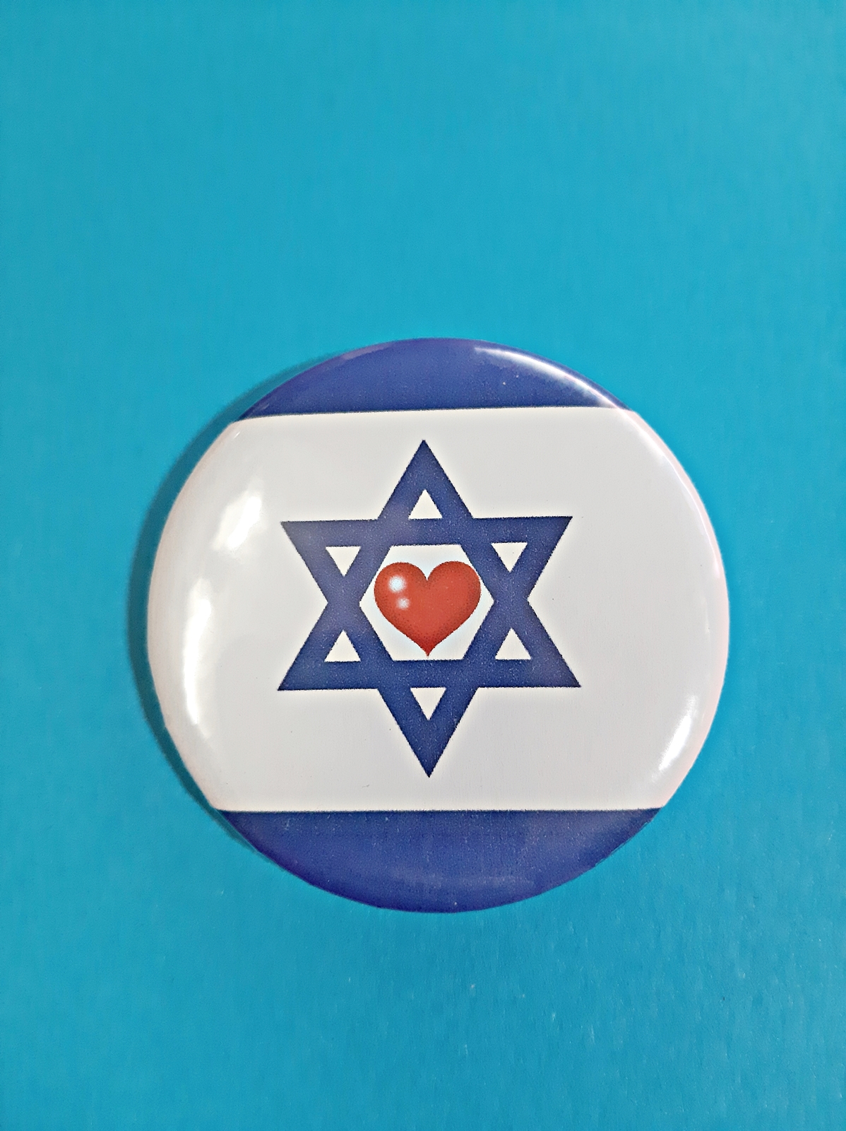 Der Anstecker zeigt die Israelfahne mit einem roten Herz inmitten des Magen Davids.